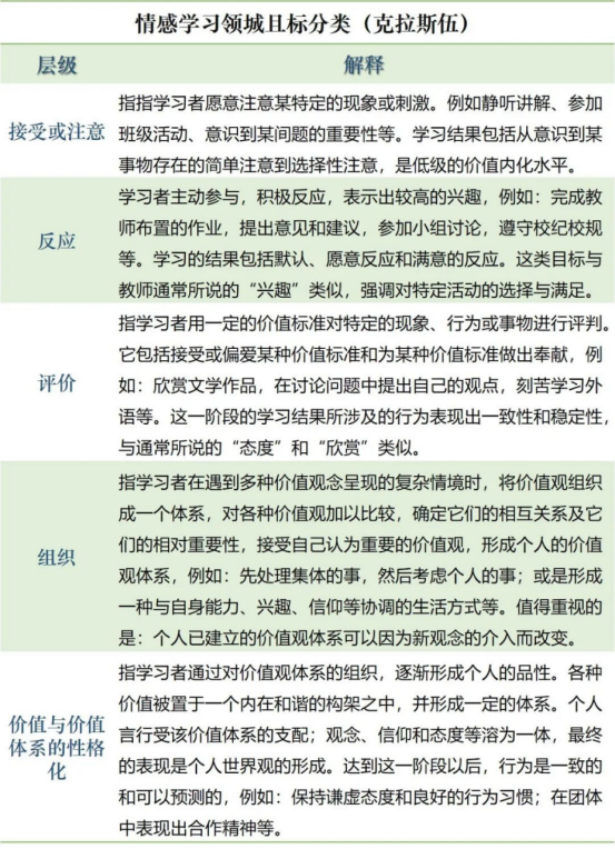 情感是人对外界刺激的肯定或否定的心理反应,如喜欢、厌恶等。人的情感会影响人做出的行为选择。情感学习对于形成或改变态度、提高鉴赏能力、更新价值观念、培养高尚情操等密切相关。这是学校教育的一个重要组成部分,然而,由于人的情感反应更多的表现为一种内部心理过程,具有一定的内隐形和抽象性,因而这个领域的学习目标难以描述。1964年克拉斯伍等人制定了情感领域的教育目标分类,他们依据价值内化的程度,将情感领域的目标共分为五级:
