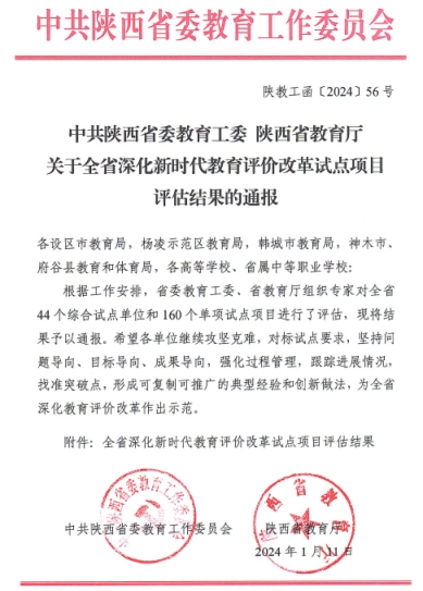 2024年1月,陕西省委教育工委、省教育厅正式发文公布《关于全省深化新时代教育评价改革试点项目评估结果的通报》,我校获得“优秀”等次。2022年6月,我校入选“陕西省深化新时代教育评价改革综合试点单位”。试点工作开始后,学校党委和行政高度重视,专门成立项目工作领导小组,主要领导担任领导小组组长,亲自安排部署,各项目组认真扎实开展相关工作,统筹推进项目实施。项目牵头部门制定了《陕西财经职业技术学院教育评价...